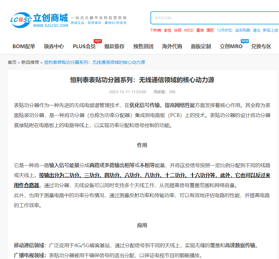 恒利泰表貼功分器系列:無線通信領(lǐng)域的核心動力源-立創(chuàng)商城 (szlcsc.com)