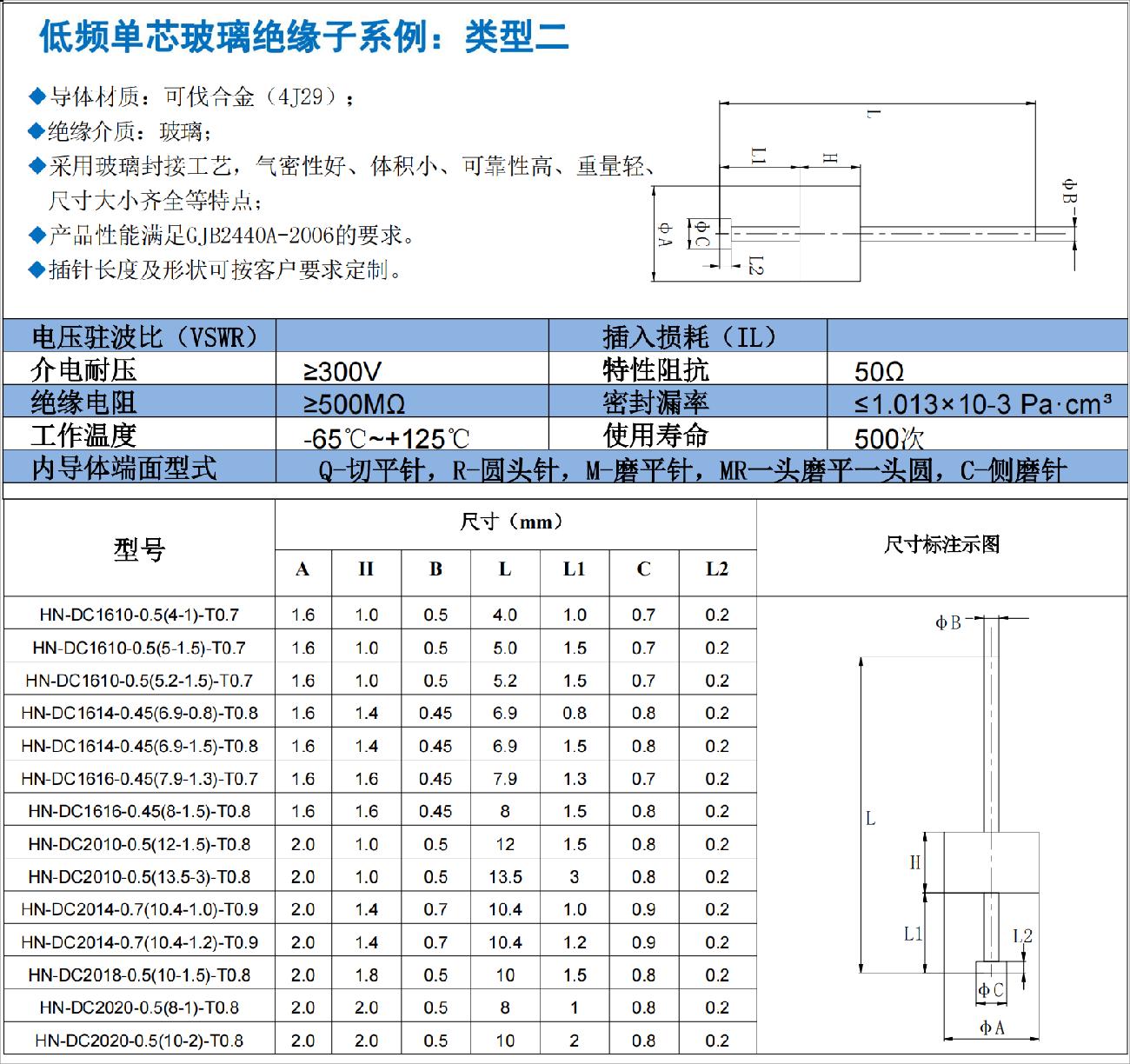 產(chǎn)品描述:介質(zhì)耐壓≥300V 絕緣電阻≥5000MΩ 密封漏率:≤1.013×10-3 Pa·cm3 /s(He) 工作溫度:-55°- 125° 導(dǎo)體外徑、高度及插針的直徑、形狀和長(zhǎng)度均可按客戶要求定制