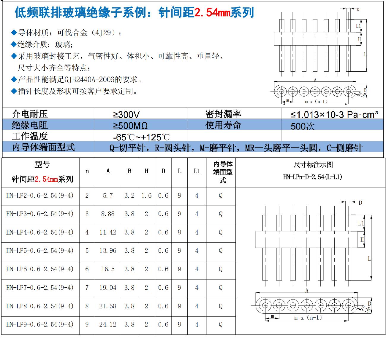 產(chǎn)品描述:聯(lián)排4插針 介質(zhì)耐壓≥300V 絕緣電阻≥500MΩ/DC500V 密封漏率:≤1.013×10-3 Pa·cm3(He) 工作溫度:-65°~+125° 導(dǎo)體外徑、高度及插針的直徑、形狀和長(zhǎng)度均可按客戶要求定制