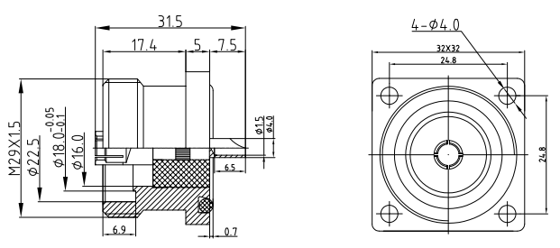 替代型號:L29/ Din / 7/16母頭法蘭安裝射頻同軸連接器 DC-3GHz 阻抗:50Ω 駐波比≤1.2